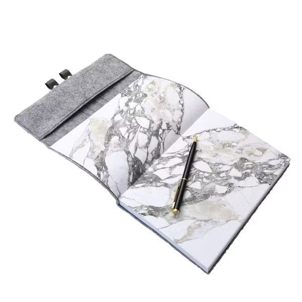 Flexible cover ruled journal with felt wrap, vegan leather strap, and marble interior. Ideal for writing, planning, or gifting.